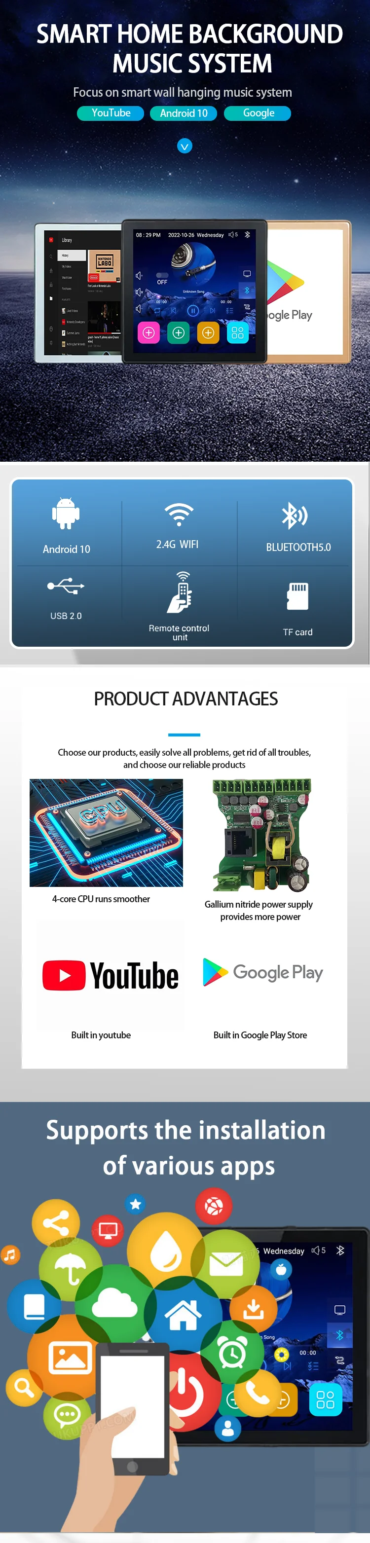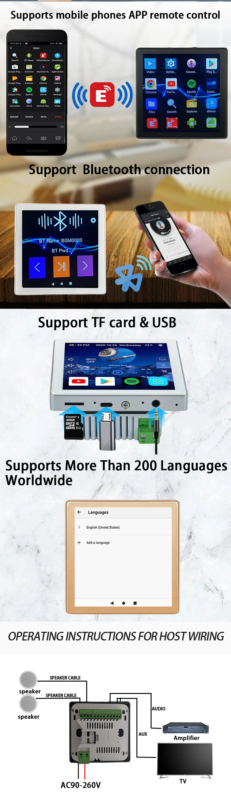 Touch Screen 4 Inch Android 10 Smart Home Audio System Alexa Voice Control WiFi Background Music Wall Amplifier